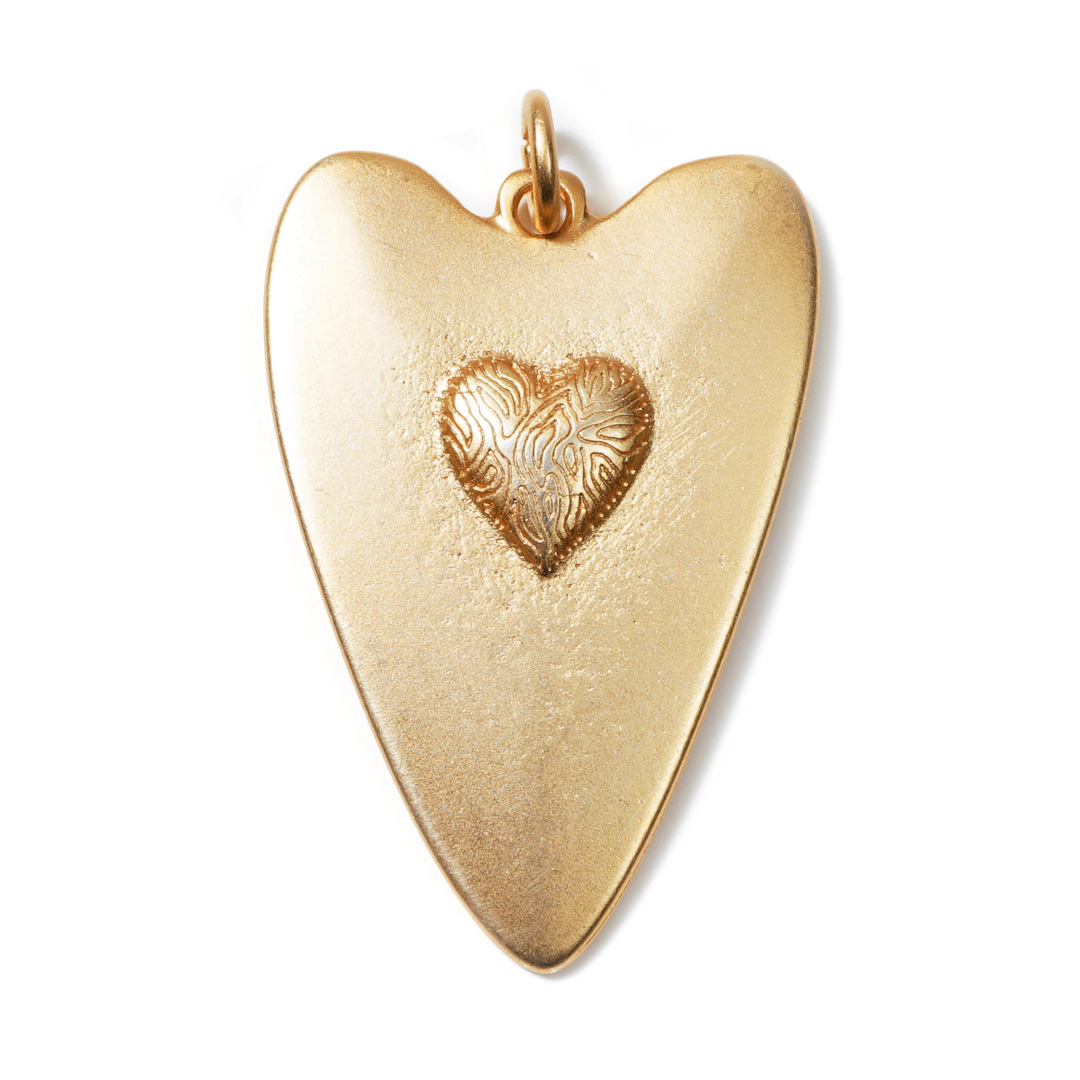 Wie schön ist das denn! Ein kunstvoll verziertes bauchiges Herz erhebt sich von einer stilvollen flachen Herzform. Ein liebevoller und edler Hingucker. Die Rückseite ist graviert mit dem Mutmacher: FOLGE DEINEM HERZEN.