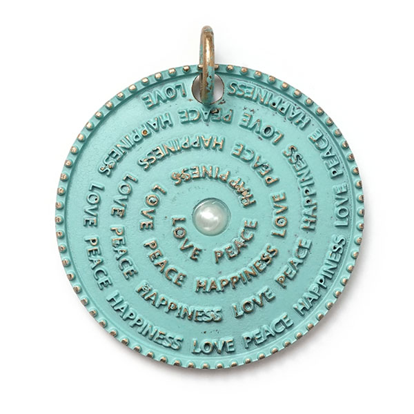 Harmonie und Design für die Ewigkeit: coole Scheibe im VintageDesign Gold-Türkis mit spiralenförmiger Inschrift "LOVE PEACE HAPPINESS".