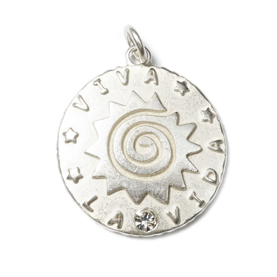 Amulett mit eingearbeitetem klaren Strass, Sonnensymbol und erhabenen Lettern: VIVA LA VIDA.