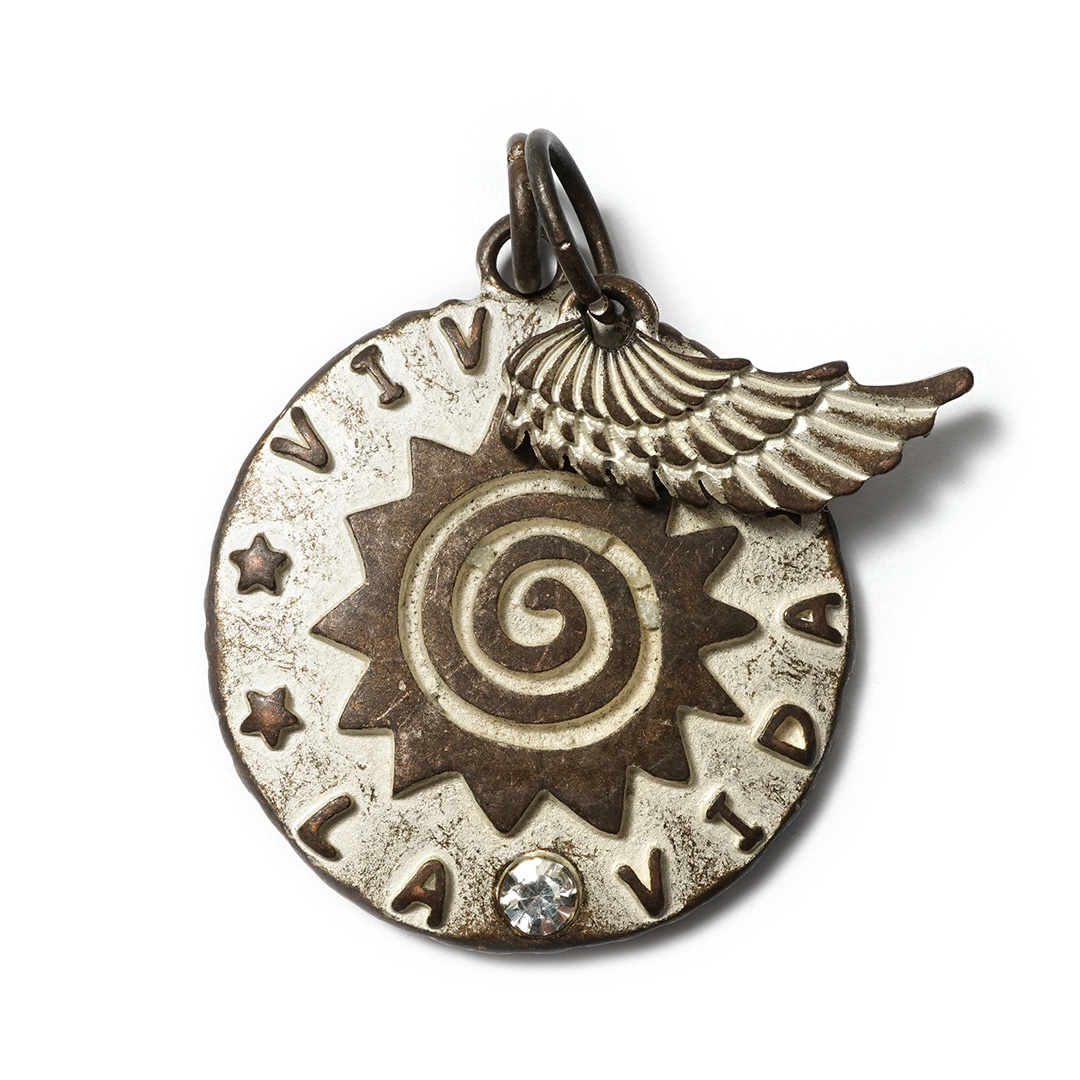 Amulett mit eingearbeitetem klaren Strass, Sonnensymbol und erhabenen Lettern: VIVA LA VIDA.