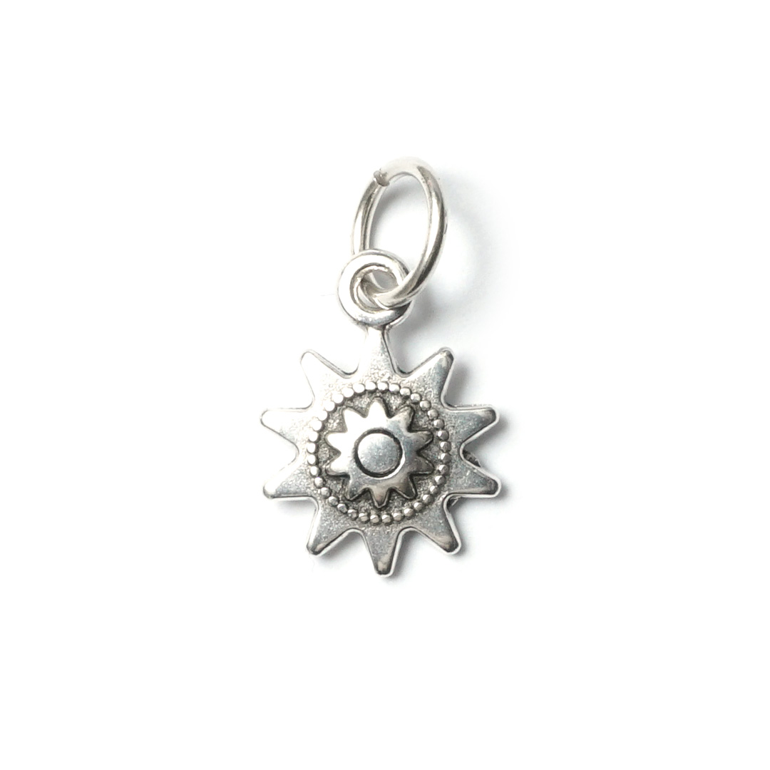 Dieser versilberte Schmuckanhänger verkörpert die strahlende Kraft und Schönheit der Sonne. Mit reliefartigen Verzierungen, Ornamenten und Mustern wird die Sonne kunstvoll dargestellt.