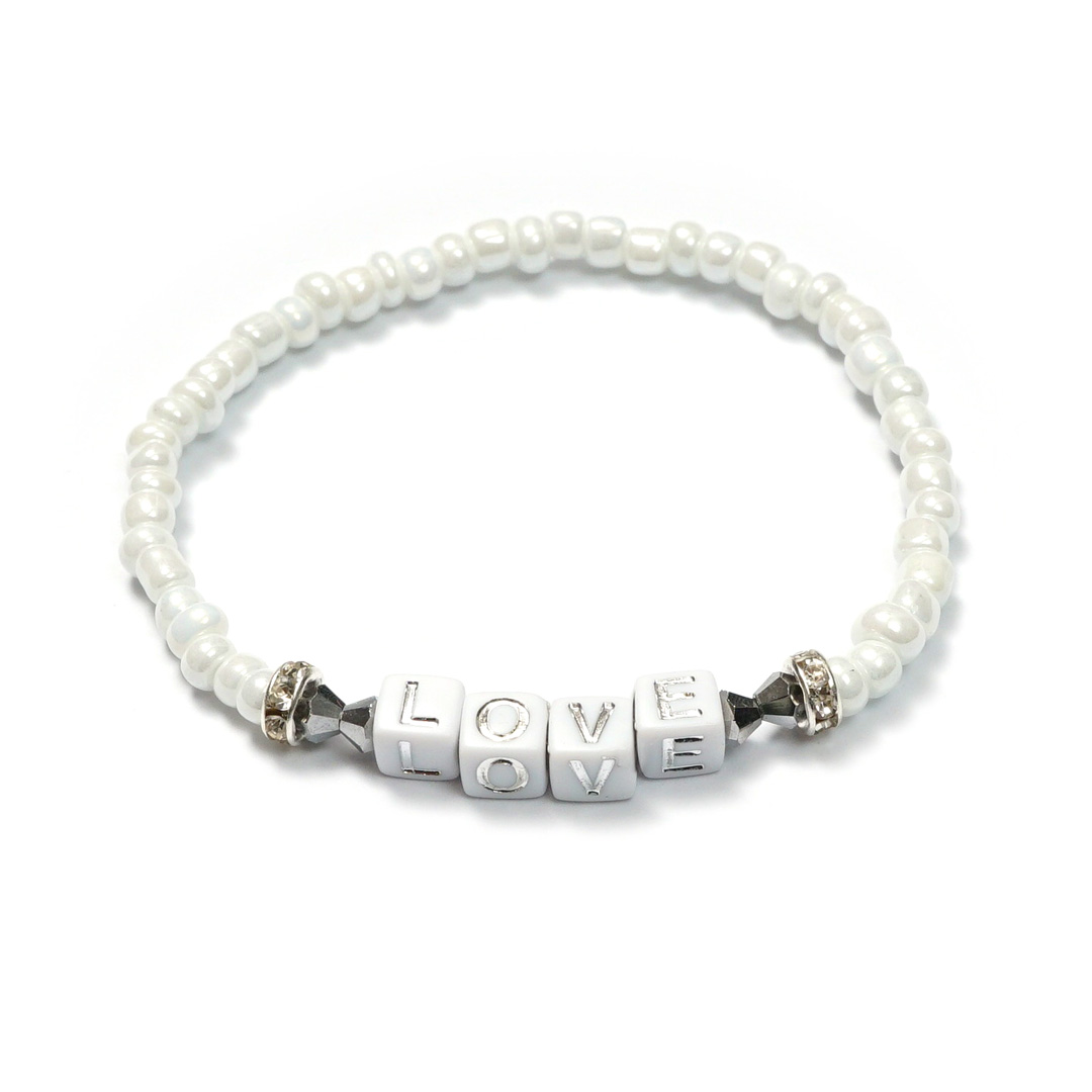 LOVE! Buchstaben-Armband mit AcrylPerlen und attraktiven Beads auf elastischem Band.