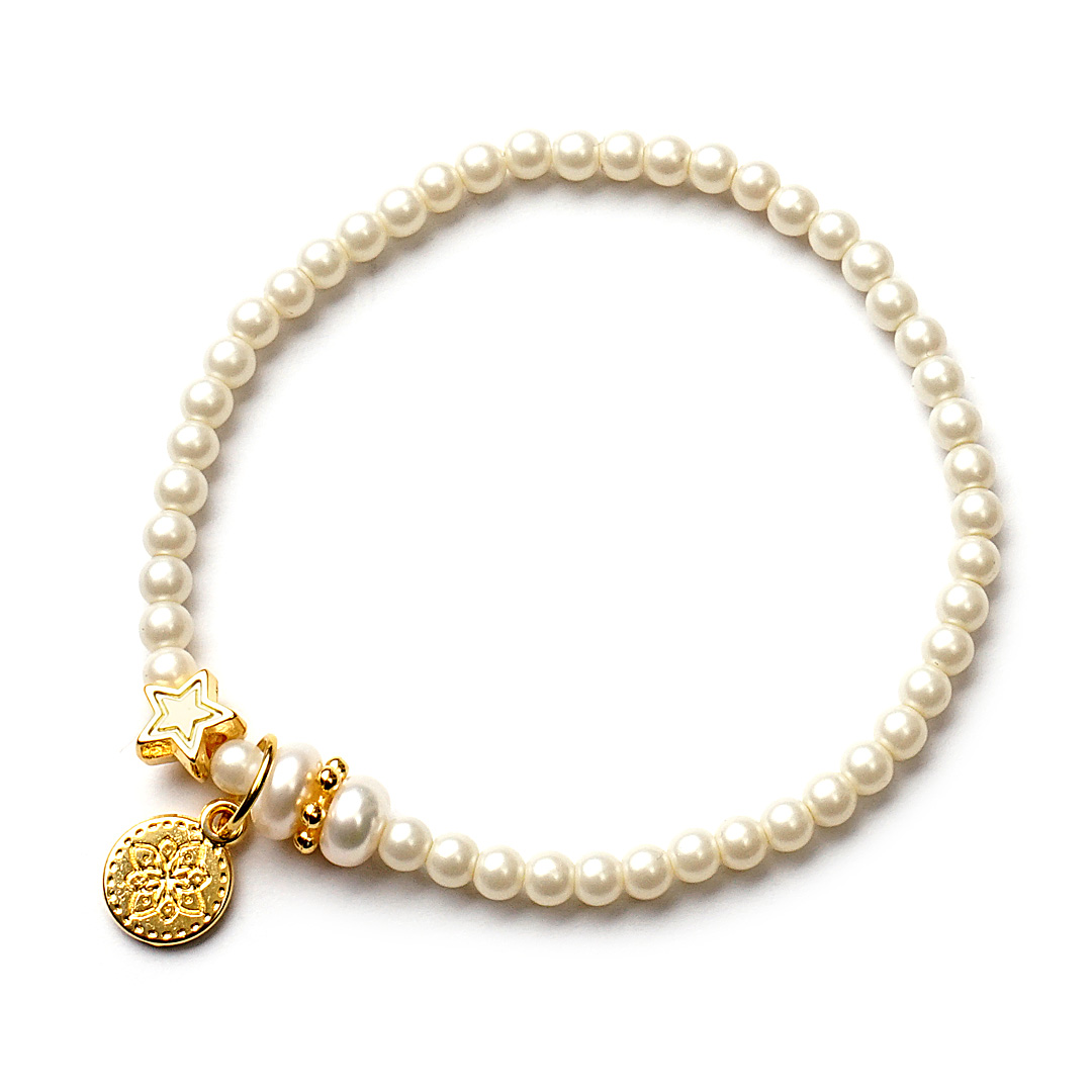 Entdecke das Perlen Design Armband Amour, ein ultraleichtes Schmuckstück, das die Leichtigkeit der Liebe einfängt. Die zarten, perlenartigen Glasperlen werden durch das vergoldete Amulett Amour und den strahlenden Stern zu einem Ausdruck romantischer Verbundenheit.