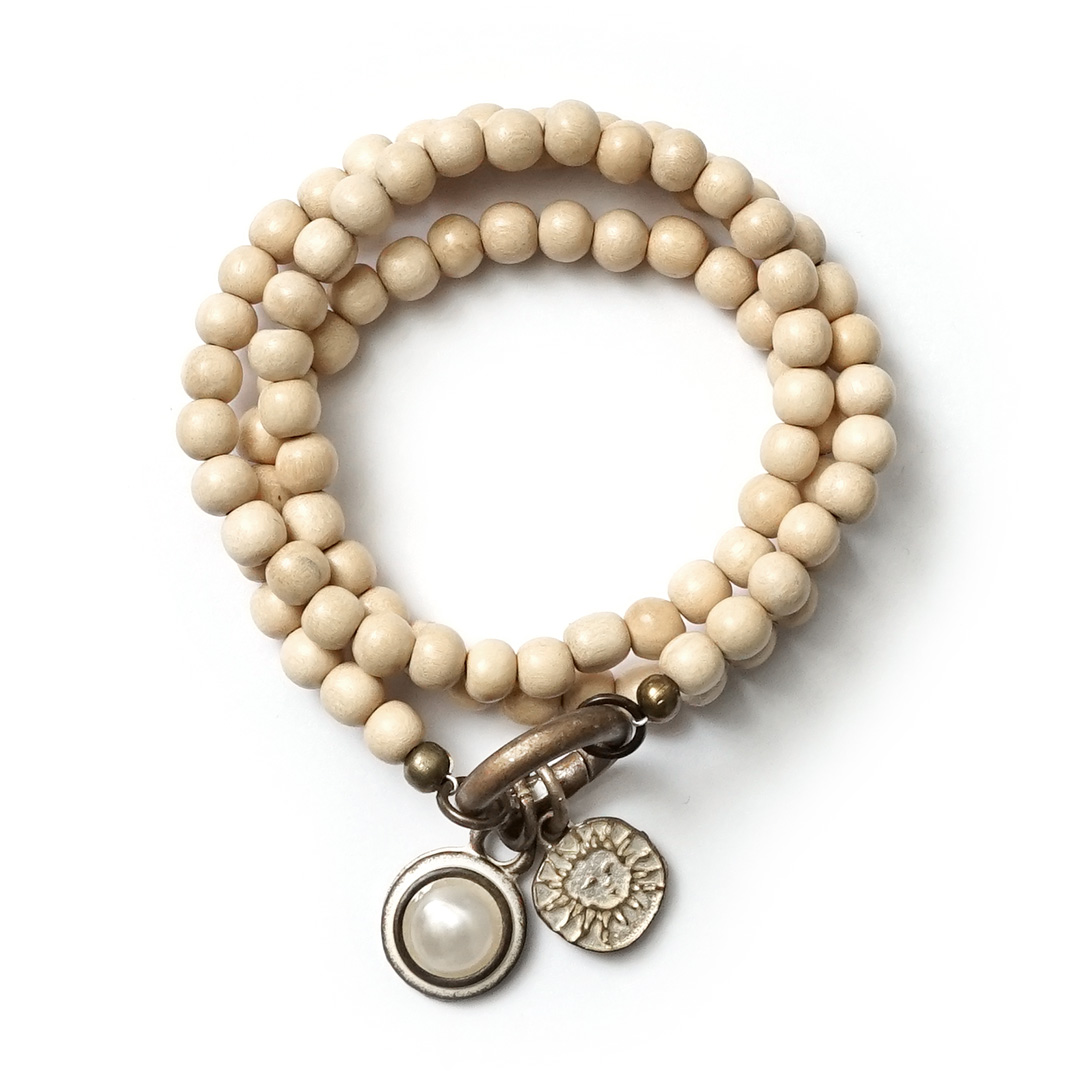 3-fach gewickeltes sandfarbenes Armband mit handgeschliffenen, vegetabil gefärbten Perlen aus Akazienholz. Im Mix&Match Ring sind die SchauTime Amulettes Perle Sahara und Sunshine Sahara eingesetzt.