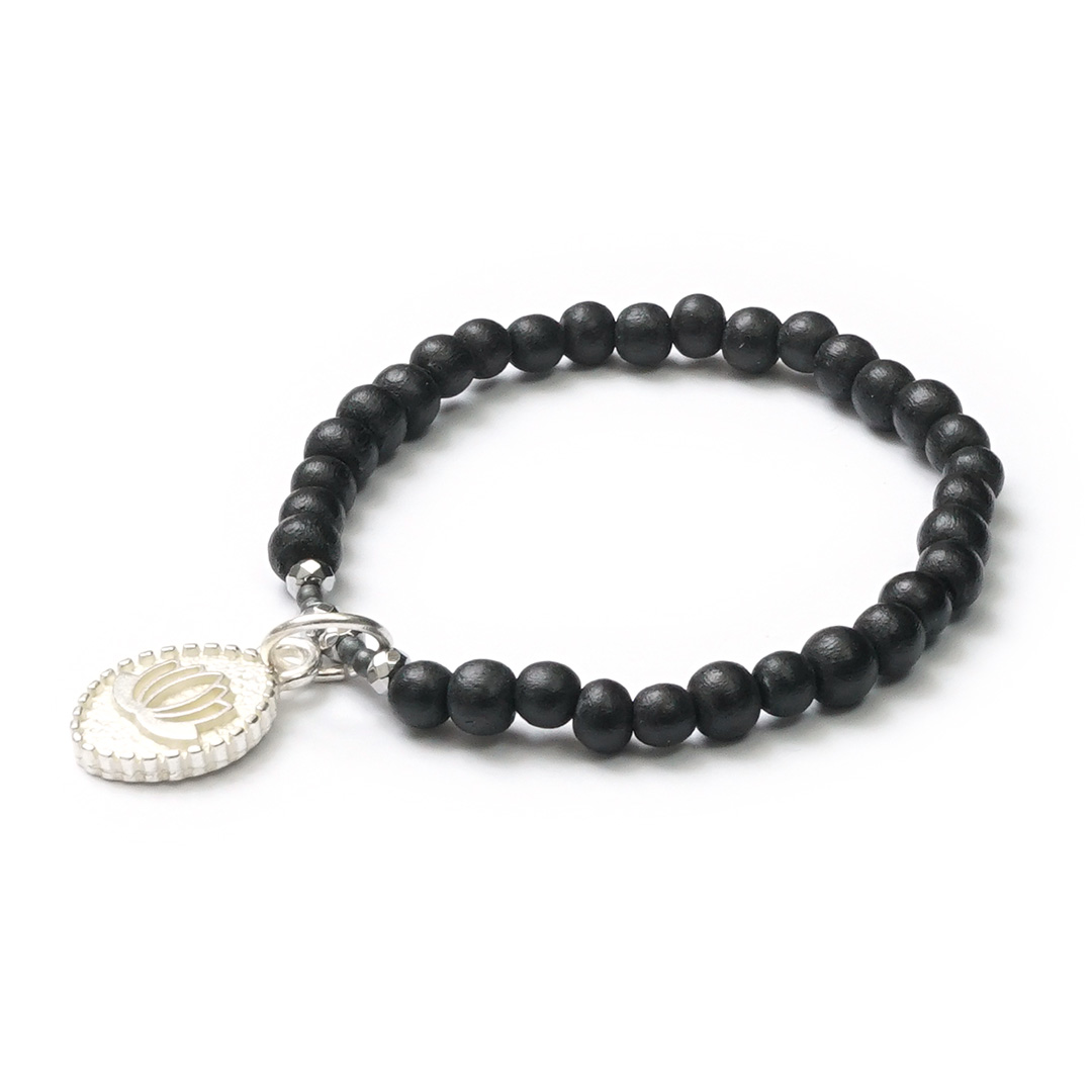 Stilvolles, schwarzes Armband mit handgeschliffenen, vegetabil gefärbten Perlen aus Akazienholz. Das eingebundene SchauTime Amulett Lotus im Design SilverShiny macht dieses Armband zu etwas ganz Besonderem.