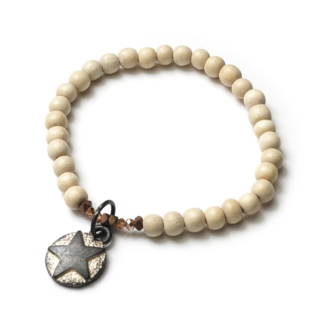 1-fach gewickeltes sandy Armband mit handgeschliffenen, vegetabil gefärbten Perlen aus Akazienholz. Als Blickfang ist das Amulett „Stern" eingearbeitet.