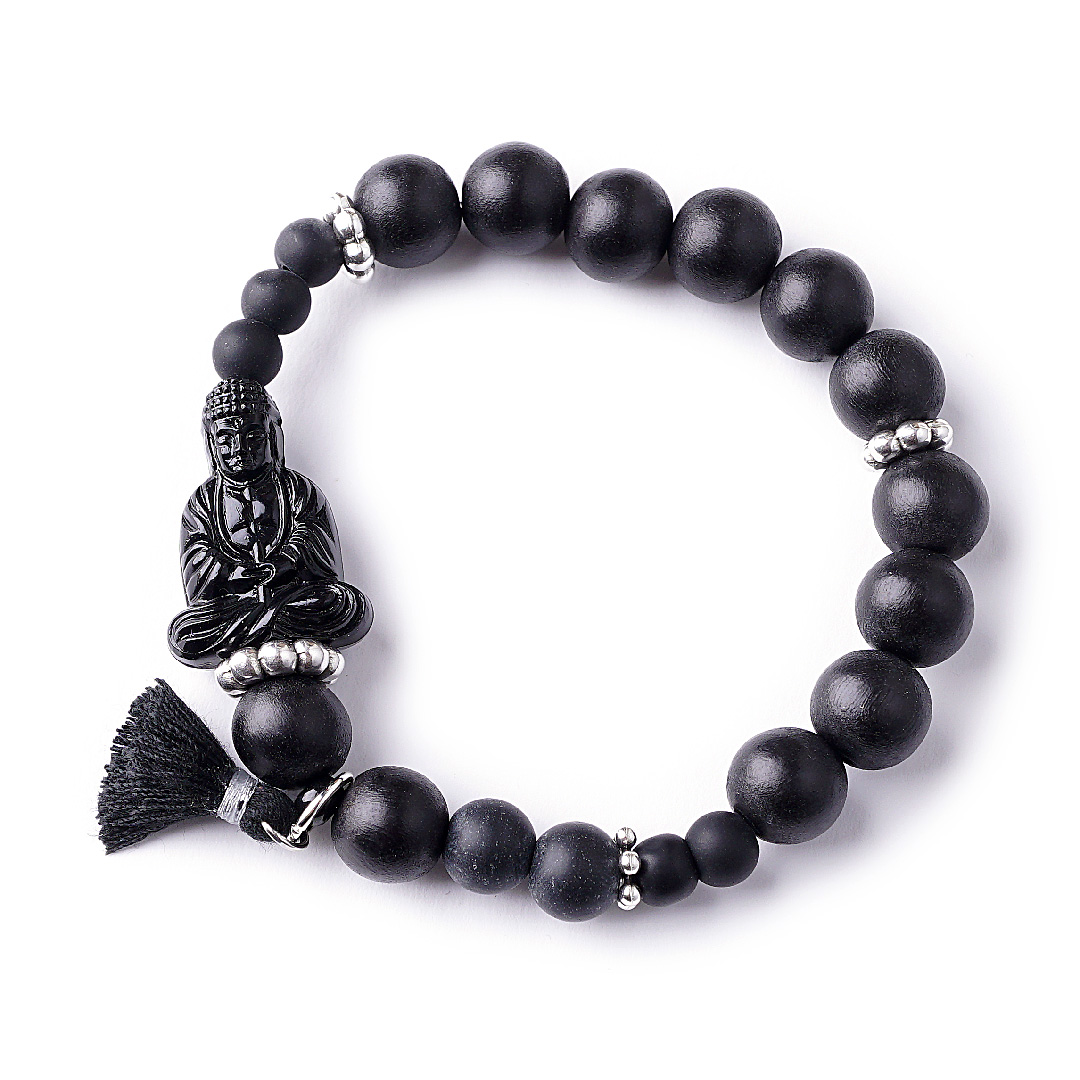Im Zentrum dieses besonderen Designs stehen großzügige Perlen aus pflanzlich gefärbtem Akazienholz. Das satte Schwarz verleihen dem Armband eine magische Haptik. Zwischen diesen harmonischen Kugeln ist ein filigranes Buddha-Objekt kunstvoll eingearbeitet – ein subtiles Symbol für Achtsamkeit und innere Ruhe.