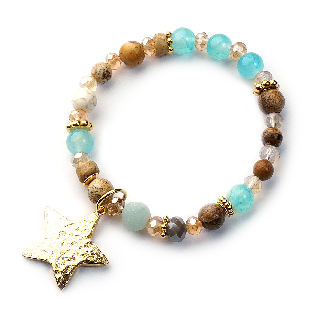 Als Blickfang ist das vergoldete Amulett Stern eingebunden. Seit jeher faszinieren die Menschen die strahlenden Sterne, die wie funkelnde Diamanten in der Nacht leuchten. Im Laufe der Zeit wurde der Stern zum Symbol für Begleitung, Vertrauen, Schutz und all das, wovon wir träumen. Heutzutage begegnen uns Sterne nicht nur am Himmel, sondern auch in Form von Bewertungen für herausragende Leistungen. Als Amulett verkörpert der Stern all diese positiven Kräfte und ist zugleich äußerst attraktiv anzusehen.