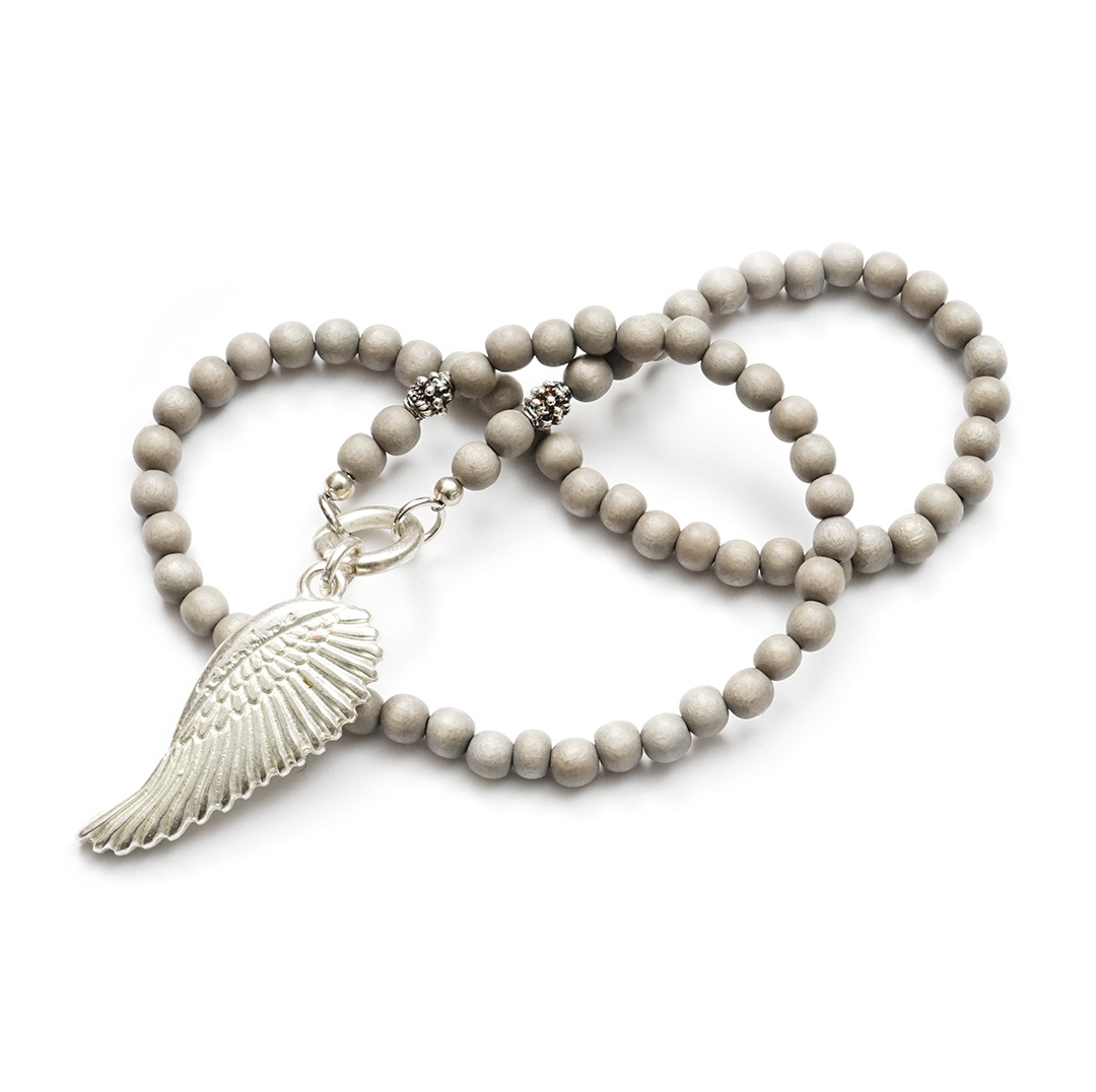 Stilvolle mittellange Wechselkette mit ca. 70 steingrauen Perlen aus Akazienholz. Silberne Beads zwischen den handgeschliffenen und vegetabil gefärbten Perlen vollenden das exklusive Design.