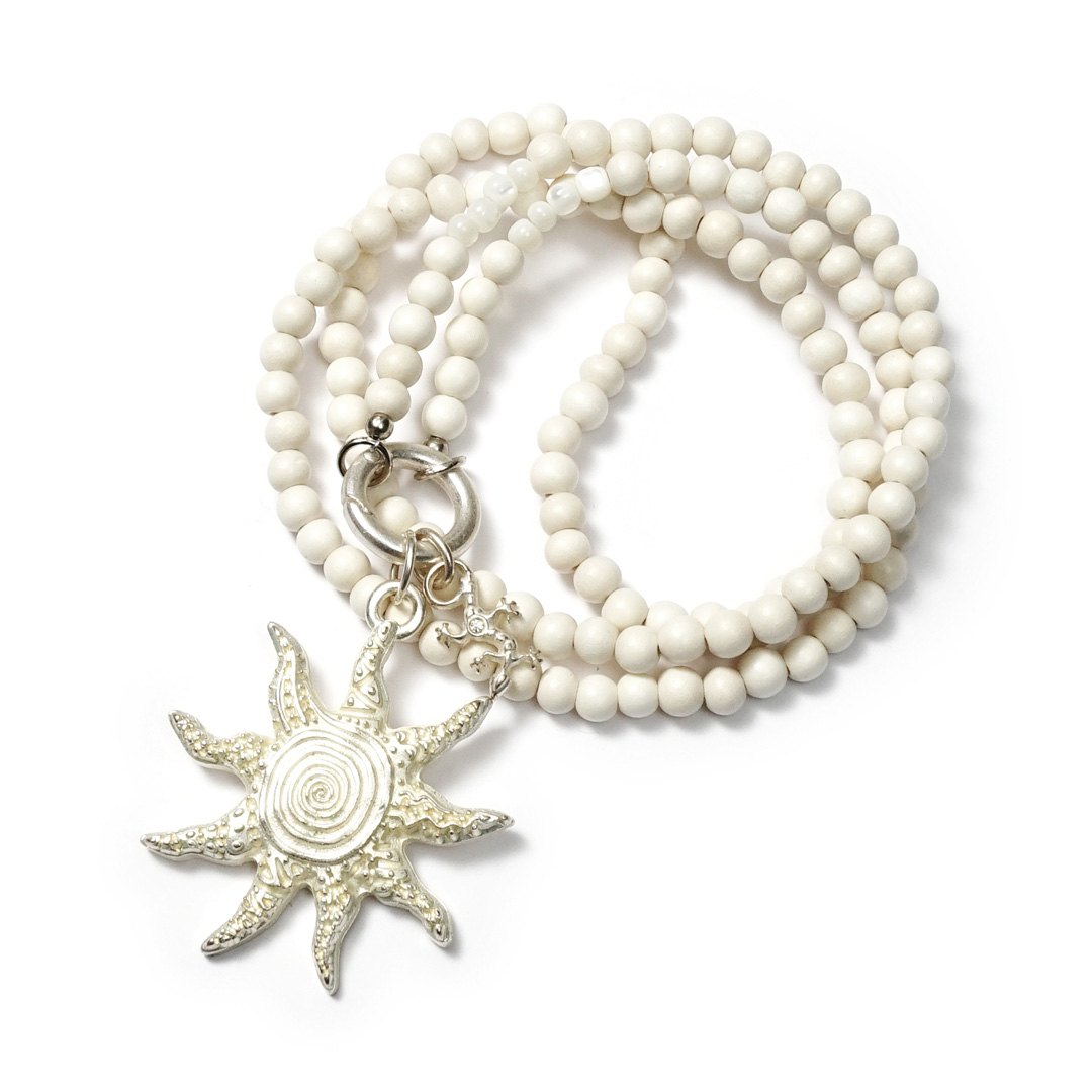 Stilvolle lange Wechselkette mit ca.130 offwhite Perlen aus Akazienholz. Offwhite Muschelkerne zwischen den handgeschliffenen und vegetabil gefärbten Perlen vollenden das exklusive SilverShiny Design.