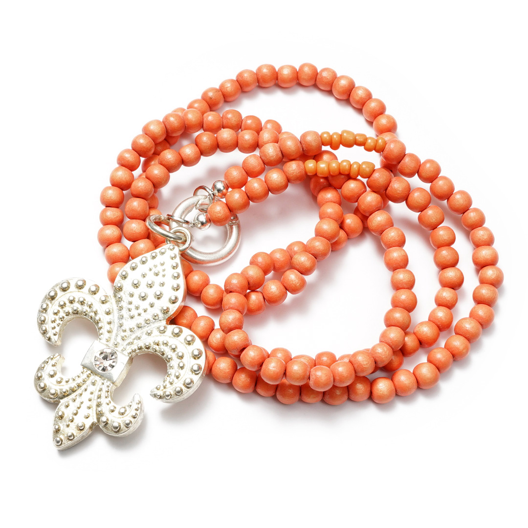 Trend Sommerfarben: lange intensiv-orange Wechselkette mit handgeschliffenen und vegetabil gefärbten Perlen aus Akazienholz. Eigenwilliges Design durch kunstvoll eingebundene Beads. Der Mix&Match Ring für Amulettes ist in den Designfarben SilverShiny, GoldShiny und Sahara erhältlich.