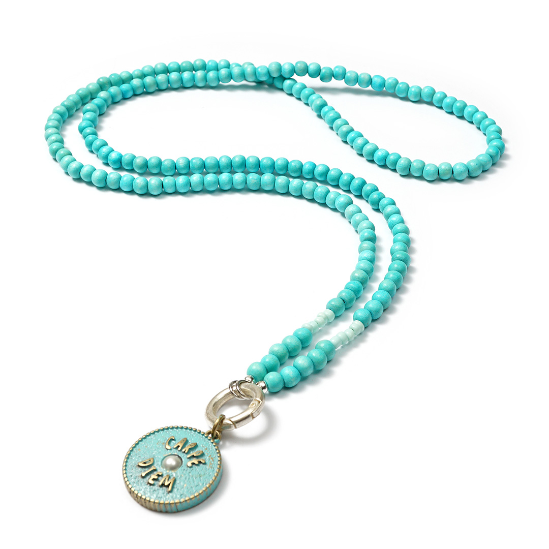 Stilvolle Wechselkette mit handgeschliffenen und vegetabil gefärbten Perlen aus Akazienholz. Attraktives Design durch kunstvoll eingebundene bezaubernde Beads.