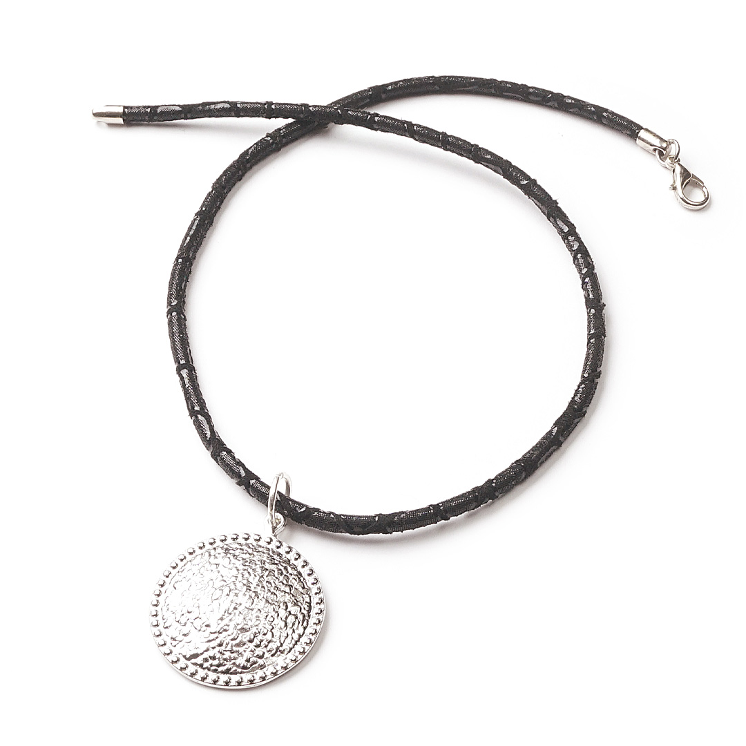Entdecke das Amulett „Aegis“, ein Schmuckstück, das dich mit der Stärke und Weisheit der Göttin Athene umgibt. Die leicht konvexe, gewölbte Scheibe, umrahmt von einem feinen, gepunkteten Rand, wird zu deinem persönlichen Schutzschild im modernen Alltag.