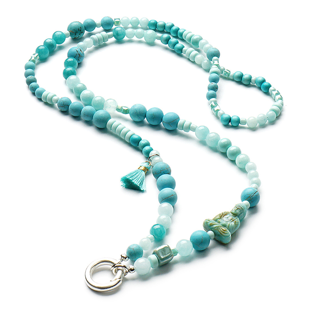 Tauche ein in ein Meer aus Türkis! Diese Designerkette ist ein echtes Highlight für alle, die das Besondere lieben. Die Kombination aus unterschiedlichsten Perlen – von marmorierten Keramikobjekten bis hin zu glänzenden Glasschliffen – sorgt für einen lebendigen und aufregenden Look. Die Farben sind voller Licht und bringen gute Laune in deinen Alltag.