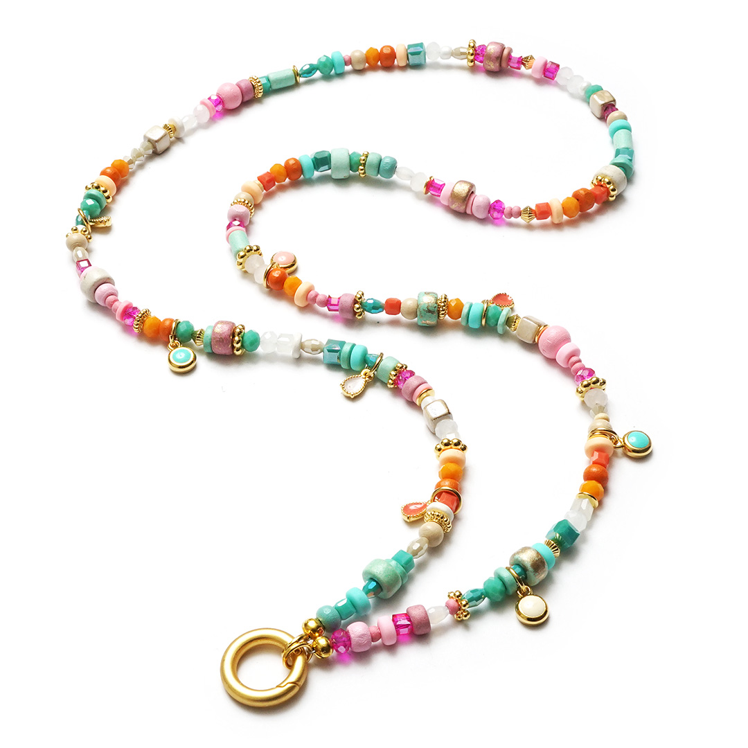 Joy! Dieses SchmuckDesign mit positivem und emotionalem Look begeistert. Zusammen spielen Jade Edelsteine, italienische Kristallperlen, griechische Keramikperlen, vergoldete Emaille-Beads, colorierte Holzperlen und stilvolle Design-Beads in angesagten Modefarben. Diese einzigartige Kombination verleiht jedem Outfit positive Schwingungen.