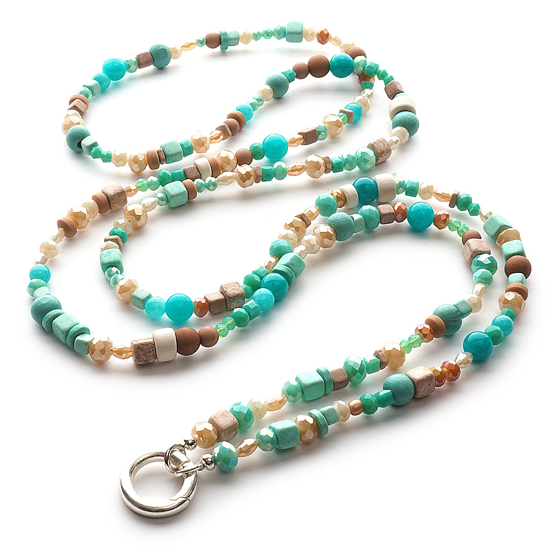 Tauche ein in die Farbenpracht der Karibik mit unserer neuen extralangen Wechselkette "Karibik SilverShiny". Diese einzigartige Kette vereint intensive Türkisnuancen von tiefem Blau bis hin zu frischem Grün mit warmen, erdigen Brauntönen. Die unterschiedlichen Oberflächen der Perlen – von glatt bis matt, von transparent bis opak – schaffen ein faszinierendes Spiel von Licht und Schatten.