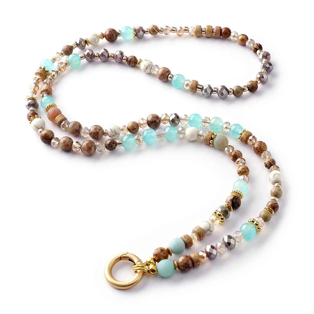 Das Besondere an der „Saitos“ ist ihr Spiel mit Kontrasten: Die Ruhe und Beständigkeit von sandfarbenen Jade-Edelsteinen und pflanzlich gefärbtem Akazienholz trifft auf das lebendige Türkis und Aqua, das an kristallklares Küstenwasser erinnert. Italienische Kristallperlen sorgen dabei für jene feinen Lichtreflexe, die das Design so lebendig und hochwertig wirken lassen.