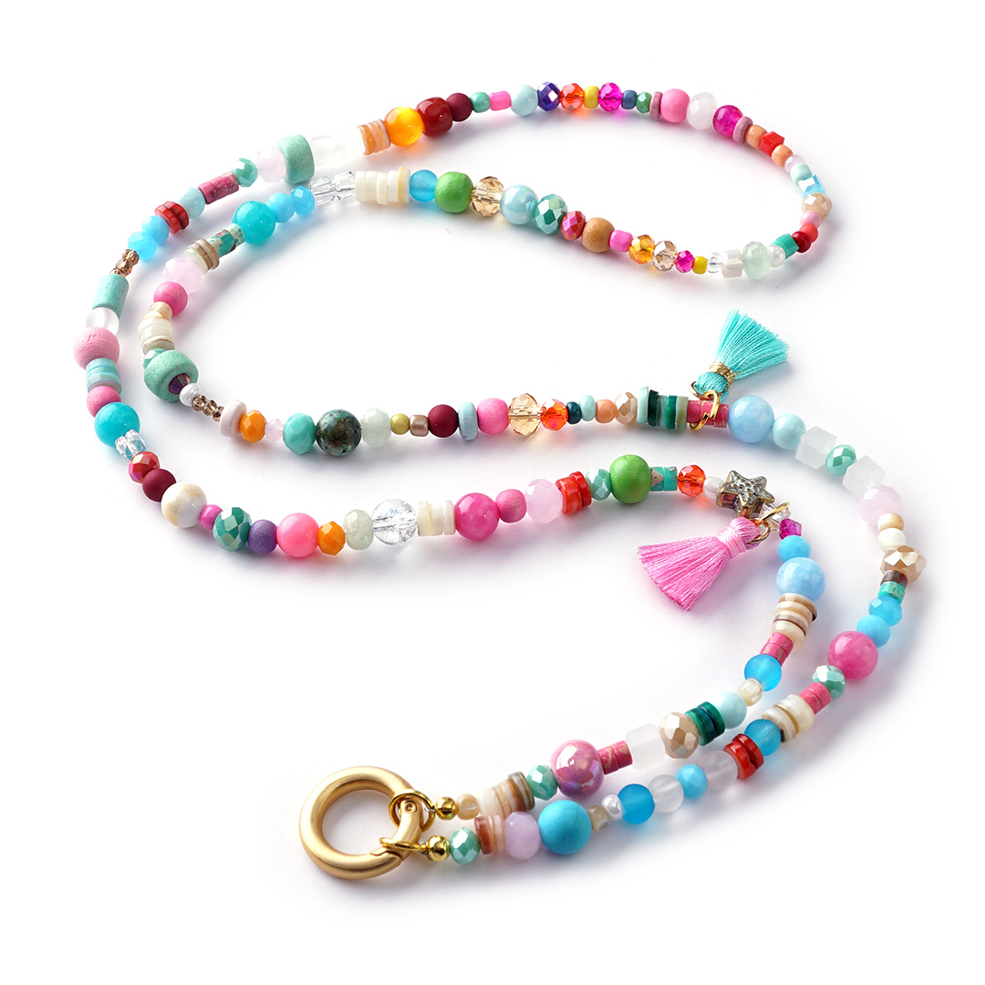 Das Design sprüht vor Good Vibes. Die kraftvollen Farben der Jade-Edelsteine treffen auf den edlen Glanz italienischer Kristallperlen und die erdige Natürlichkeit von pflanzlich gefärbtem Akazienholz. Griechische Keramikperlen und verspielte Seidenquasten setzen charmante Akzente, die jeden Blick einfangen.