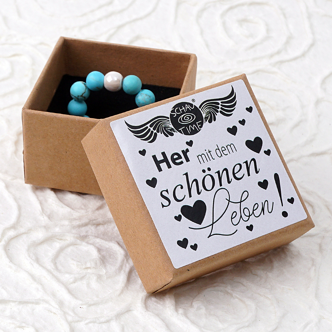 Dein SchauTime Ring kommt liebevoll verpackt in einer unserer stilvollen Ringboxen zu dir. Wir wählen die Farbe der Box und den Aufkleber mit schönen Sprüchen zufällig für dich aus. Du hast einen Wunsch? Möchtest du eine bestimmte Farbe oder Botschaft für dein Geschenk? Schreibe uns deinen Wunsch im Bestellvorgangs ins Feld "Anmerkungen". Wir tun unser Bestes, ihn zu erfüllen!