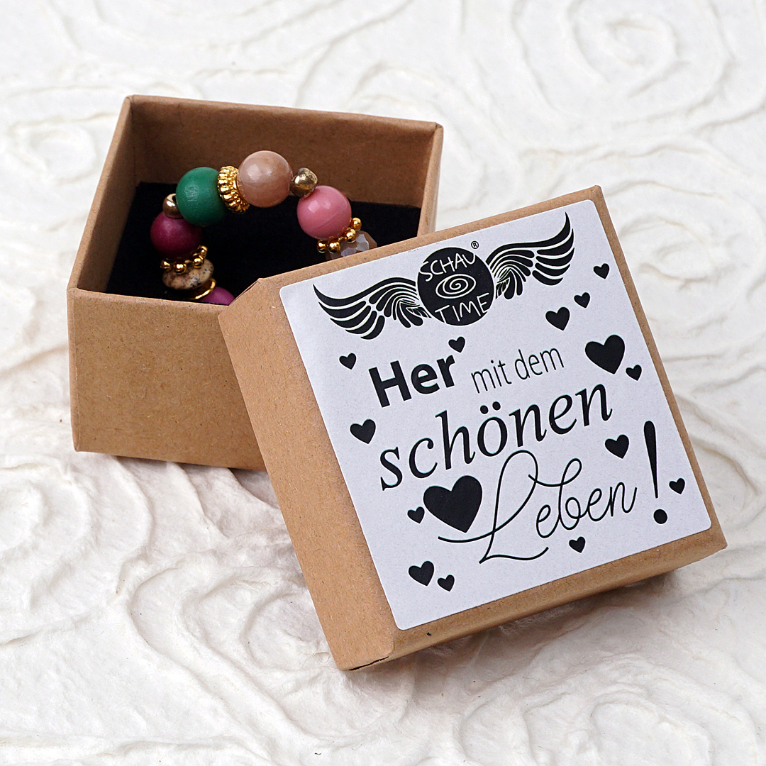 Dein SchauTime Ring kommt liebevoll verpackt in einer unserer stilvollen Ringboxen zu dir. Wir wählen die Farbe der Box und den Aufkleber mit schönen Sprüchen zufällig für dich aus. Du hast einen Wunsch? Möchtest du eine bestimmte Farbe oder Botschaft für dein Geschenk? Schreibe uns deinen Wunsch im Bestellvorgangs ins Feld "Anmerkungen". Wir tun unser Bestes, ihn zu erfüllen!