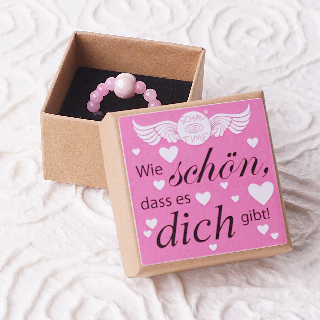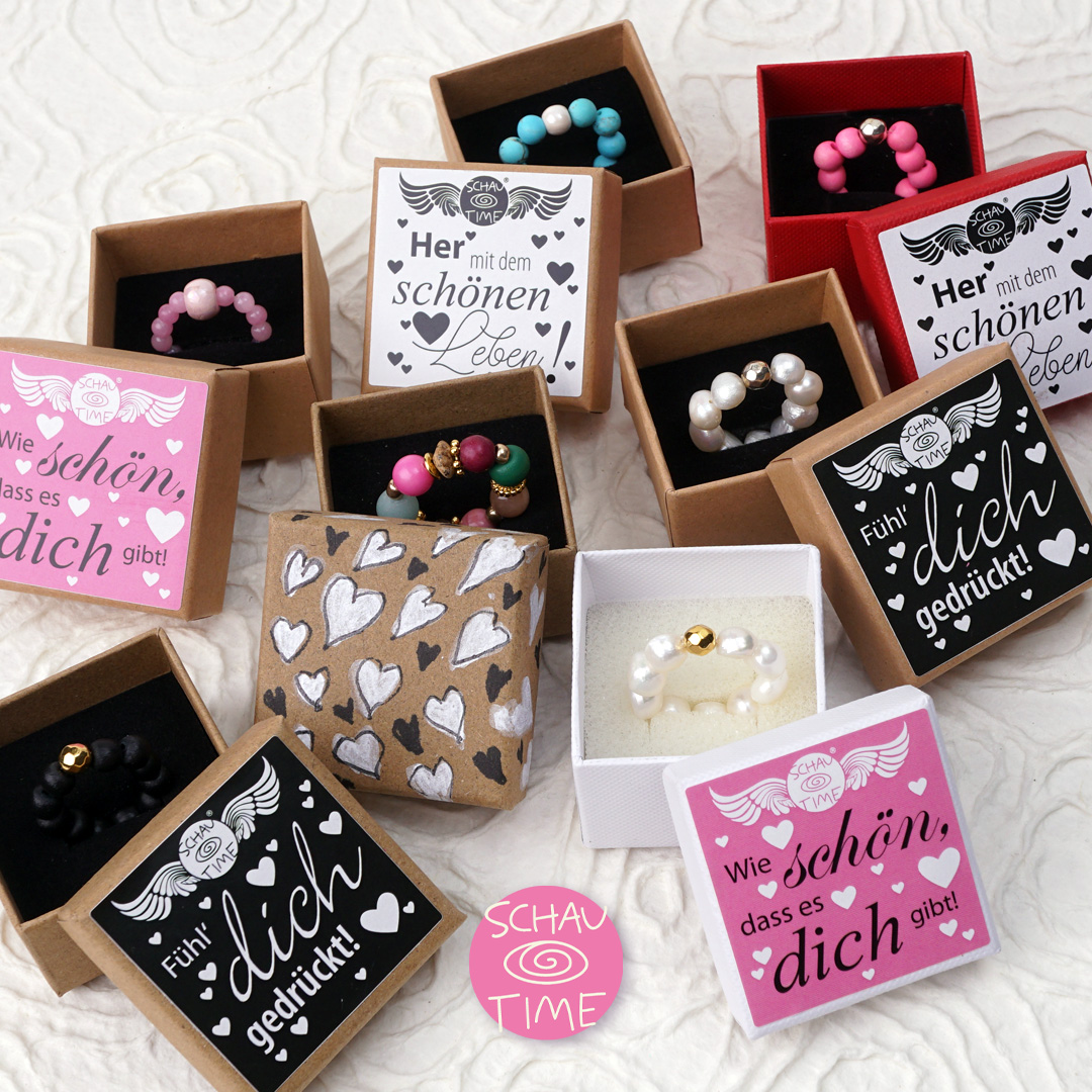 Dein SchauTime Ring kommt liebevoll verpackt in einer unserer stilvollen Ringboxen zu dir. Wir wählen die Farbe der Box und den Aufkleber mit schönen Sprüchen zufällig für dich aus. Du hast einen Wunsch? Möchtest du eine bestimmte Farbe oder Botschaft für dein Geschenk? Schreibe uns deinen Wunsch im Bestellvorgangs ins Feld "Anmerkungen". Wir tun unser Bestes, ihn zu erfüllen!